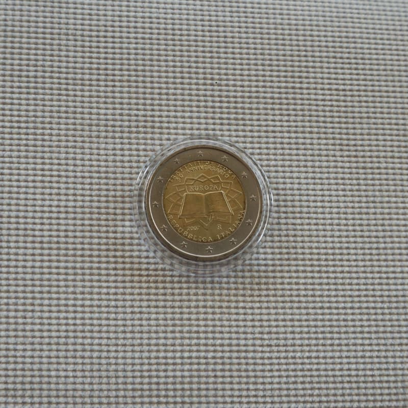 The coin shows the Treaty of Rome being signed by the six founding countries of the European Union a background evoking the paving (designed by Michelangelo) of the Piazza del Campidoglio in Rome, where the signing took place on March 25, 1957. The words ‘Treaty of Rome 50 years’, ‘EUROPE’, and ‘ITALIAN REPUBLIC appear in Italian. The coin’s outer ring bears the twelve five-pointed stars of the European Union.