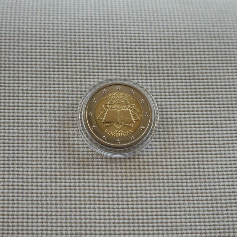 The coin shows the Treaty document signed by the six founding countries on a background evoking the paving (designed by Michelangelo) of the Piazza del Campidoglio in Rome, where the signing took place on 25 March 1957. ‘Treaty of Rome 50 years’, ‘EUROPE’, and the name of the issuing country appear in the respective languages of the euro area or Latin. Thus, the legend differs from country to country, but the image is the same. The Treaty of Rome established the European Economic Community and ultimately led to the introduction of the euro in 1999 and the euro banknotes and coins in 2002. The anniversary was celebrated on 25 March 2007. The euro area countries have marked the occasion by jointly issuing this commemorative coin. Its design was selected following a competition organized by the European mints. The coin’s outer ring bears the 12 stars of the European Union.