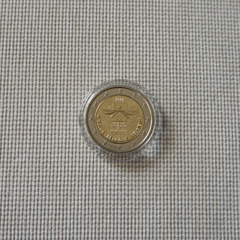 The coin shows curved lines around a rectangle marked with the figure 60. The year ‘2008’ is inscribed above the rectangle and the words ‘UNIVERSAL DECLARATION OF HUMAN RIGHTS’ underneath it. The name of the country appears below the design in its three official languages: ‘BELGIE – BELGIQUE – BELGIEN’. The mintmark and the signature mark of the Master of the Mint are shown to the left and right of the design respectively. The outer ring of the coin features the twelve stars of the European Union.