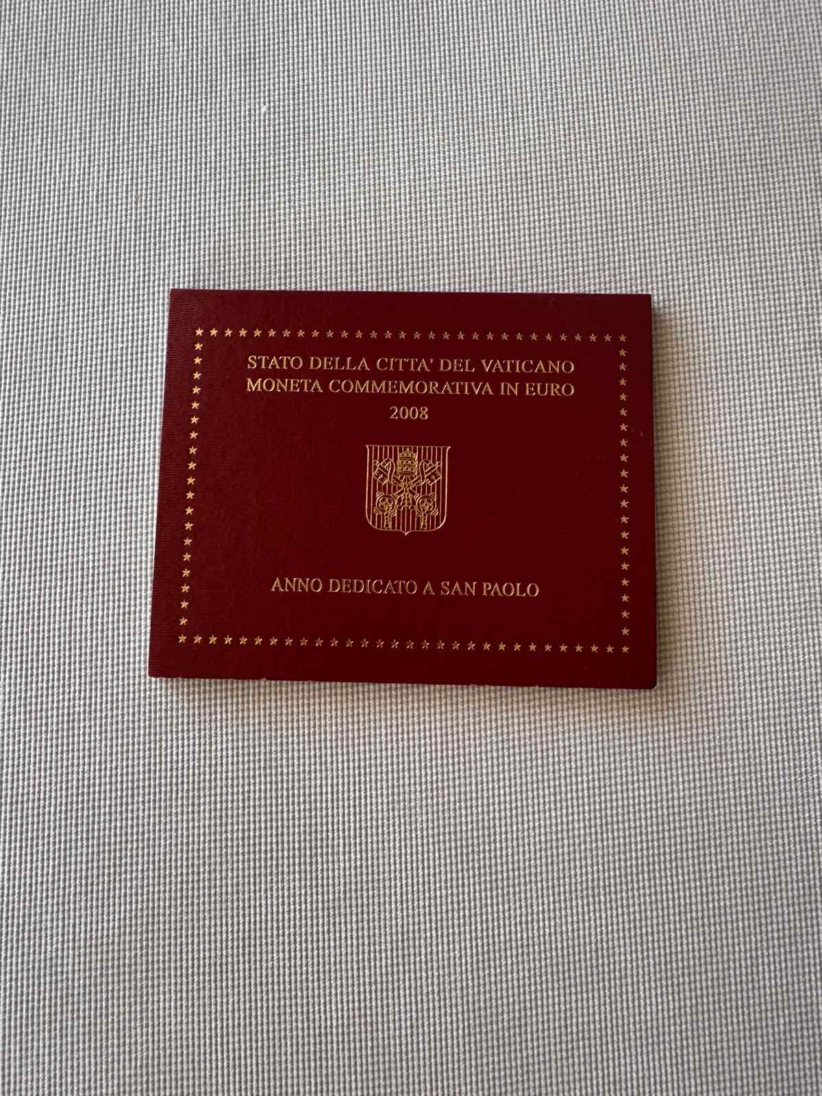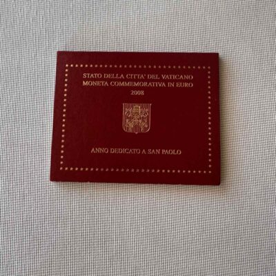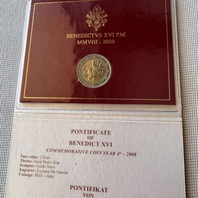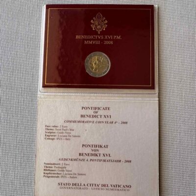 The coin depicts the conversion of Paul on the road to Damascus, which is visible in the background. Dazzled by a light from the sky, he falls from his rearing horse. To the left of the image is an inscription denoting the issuing country ‘CITTÀ DEL VATICANO’, and to the right the legend ‘ANNO SANCTO PAULO DICATO’, as well as the year ‘2008’, the mint mark ‘R’ and the artist’s name ‘VEROI’. The initials of the engraver ‘L.D.S. INC.’, Luciana De Simoni, appear beneath the image. The outer ring of the coin shows the 12 stars of the European Union.