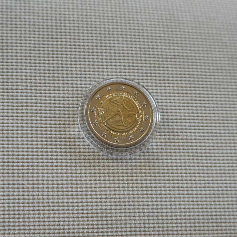 The coin commemorates the 2500th anniversary of the Battle of Marathon. The centre of the coin shows a synthesis of a shield and a runner/warrior representing the struggle for freedom and the noble ideals that the Battle of Marathon stands for. The bird on the shield symbolizes the birth of Western civilization in its present form. The coin’s outer ring bears the 12 stars of the European Union.
