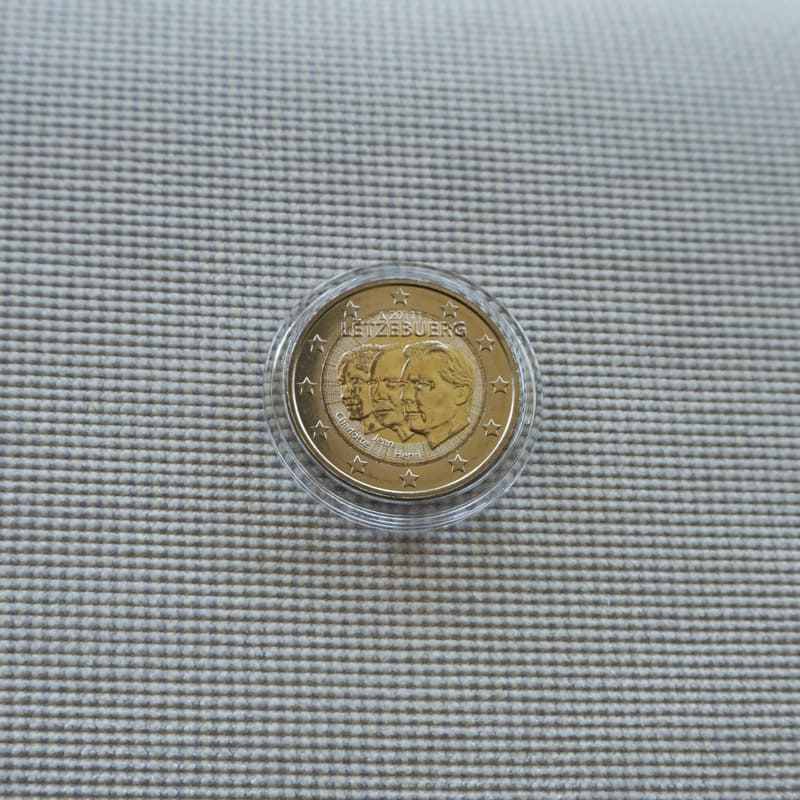 The coin depicts on the right hand of its inner part the effigy of His Royal Highness, the Grand-Duke Henri, looking to the left, and superimposed on the effigies of the Grand-Duke Jean and the Grand-Duchess Charlotte. The text “LËTZEBUERG” is depicted above the three effigies. The year-date “2011”, flanked by the mintmark and the Mintmaster mark, appears above. The name of the Royal Highness is depicted below the respective effigy. The coin’s outer ring bears the 12 stars of the European Union.