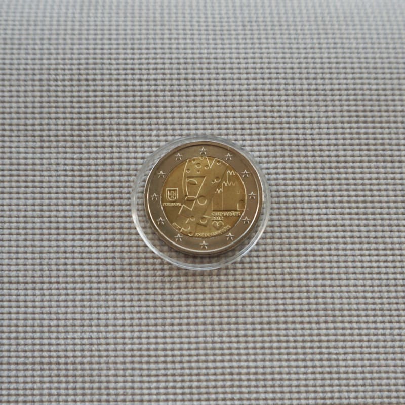 The inner part of the coin depicts a stylised image of Afonso Henriques, the first King of Portugal, together with his sword and the Castle of Guimarães, which is regarded as the birthplace of Portugal as an independent nation in the 12th century. To the left of the image is the Portuguese shield above the word “PORTUGAL”. To the lower right is the inscription “GUIMARÃES 2012” with the logo of Guimarães 2012 European Capital of Culture. Along the lower edge of the inner part are the mintmark “INCM” and the name of the designer, “JOSÉ DE GUIMARÃES”. The outer ring bears the 12 stars of the European Union.