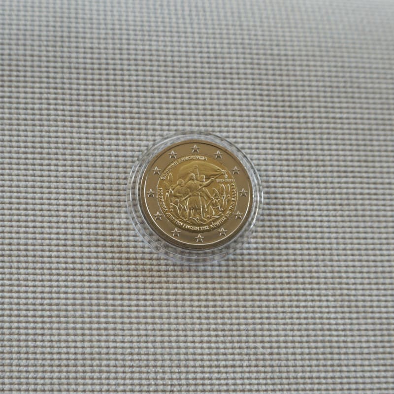 The inner part of the coin depicts Cretan rebels raising the Greek flag, a symbolic representation of Crete’s struggle for Union with Greece. On the upper side, in circular sense and with capital letters the name of the issuing country ‘Hellenic Republic’ in Greek. Underneath the words: ‘100 years of the union of Crete with Greece’ in Greek. On the right: ‘1913-2013’ and the monogram of the Greek Mint. The coin’s outer ring bears the 12 stars of the European Union