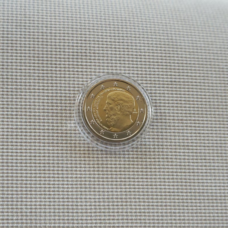 Portrait of Plato (in profile). On the left: the words ‘2 400 years since the founding of Plato’s Academy’ and ‘The Hellenic Republic’ in ancient Greek lettering. On the right: ‘2013’ and the monogram of the Greek Mint. The coin’s outer ring bears the 12 stars of the European Union.