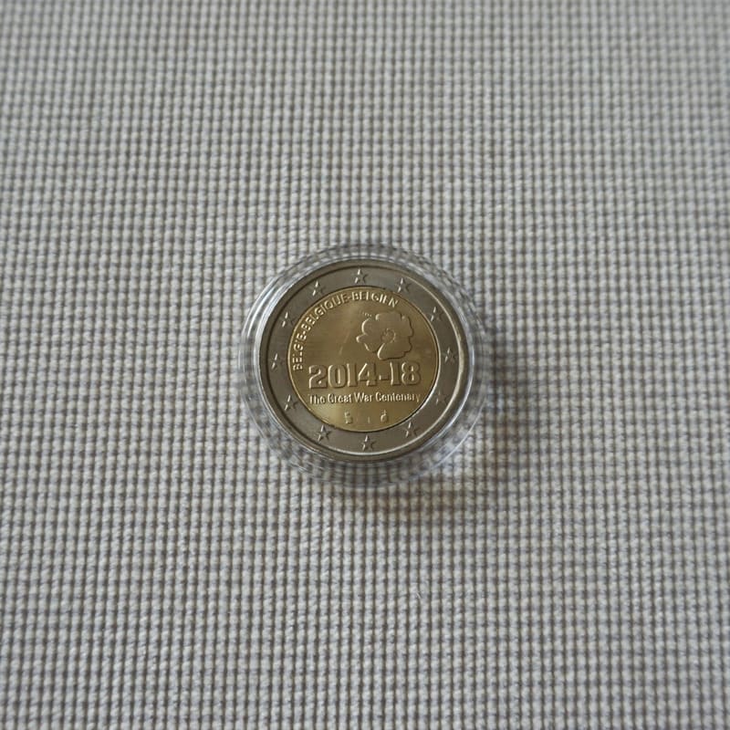 The coin’s central field depicts a poppy above the years 2014-18. Below these years appears the inscription ‘The Great War Centenary’, under which are the signature mark of the Master of the Mint and the mark of the Brussels mint, a helmeted profile of the archangel Michael. The top of the central field features the trilingual inscription ‘BELGIE — BELGIQUE — BELGIEN’ – the name of the country in Dutch, French and German. The coin’s outer ring bears the 12 stars of the European Union.