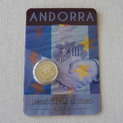 Map of Andorra with the coat of arms of the Principality highlighted inside it. At the bottom, two opposing arrows interlaced, symbolising the Customs Agreement between Andorra and the EU. Coin’s outer ring bearing the twelve stars of the European Union.