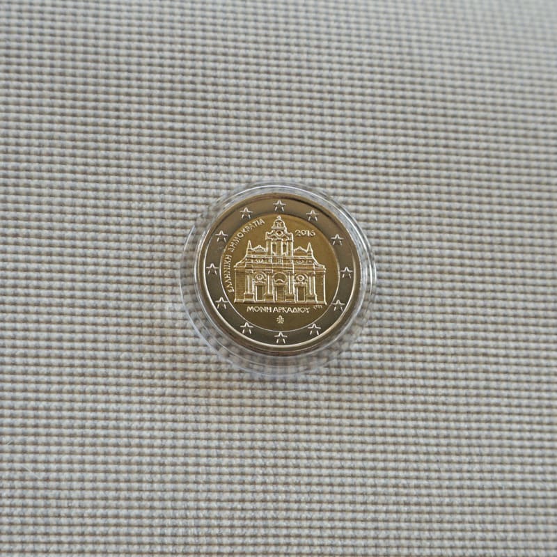 The Arkadi Monastery with its name below and the country name to the left along with the date to the upper right and a palmette, the mintmark of the Greek Mint, below the centre inscription. The monogram of the artist is at the lower right and the 12 stars of the European flag in the outer ring