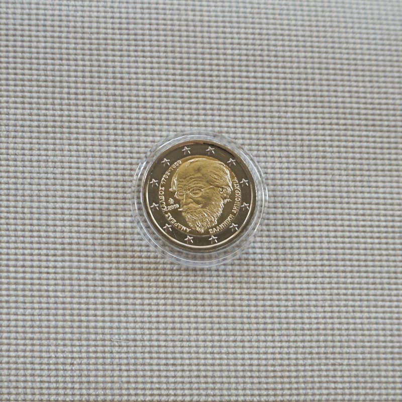 The national side of the coin features a portrait of Andreas Kalvos. Inscribed along the inner edge at the left is the name ‘ANDREAS KALVOS 1792-1869’, along with the minting year and a palmette (mintmark of the Greek Mint); inscribed along the inner edge at the right is the wording ‘HELLENIC REPUBLIC’. Also visible at the right is the monogram of the artist (George Stamatopoulos)._x005F_x000D_