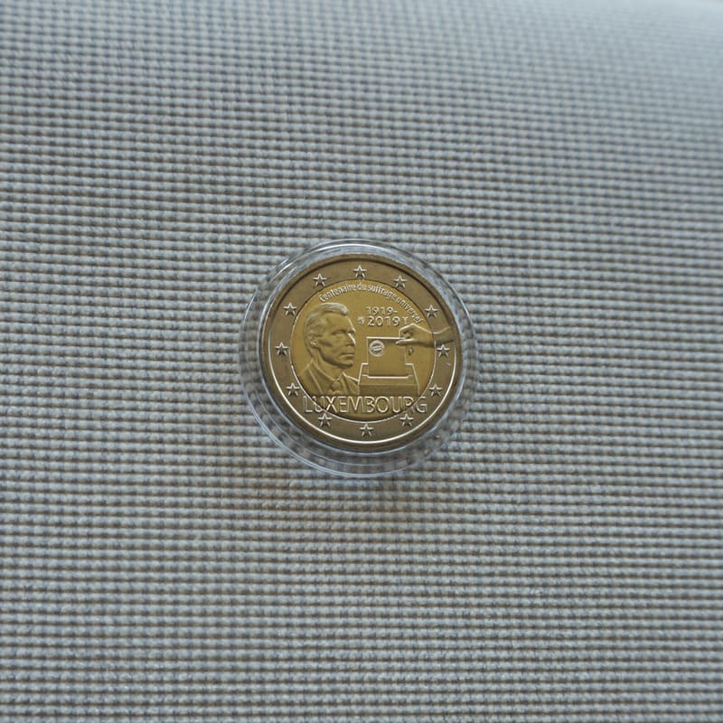 The design shows on the left hand the effigy of His Royal Highness, the Grand Duke Henri, and a ballot box where a ballot paper is being inserted by a hand to the right and the country name below. At the top, the inscription ‘Centenaire du suffrage universel’ (Centenary of the universal franchise) in a semicircle and the dates ‘1919 – 2019’ below and the second date being the year of issuing. The coin’s outer ring depicts the 12 stars of the European flag.