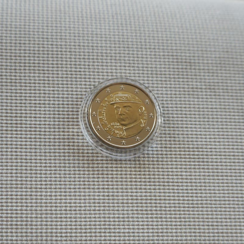 The coin’s outer ring depicts the 12 stars of the European flag.