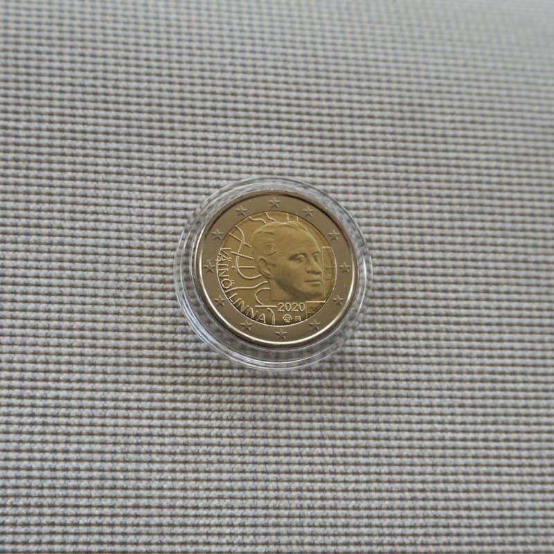 The coin celebrates the well-known late Finnish writer Väinö Linna. This year marks the centenary of his birth in 1920. The design reflects Linna’s work in a textile mill and depicts, in addition to his face, letters as weaved fabric and threads that run through his books. The inscription VÄINÖ LINNA is at the left side. At the bottom are the inscriptions of the year of issuance ‘2020’, of the issuing country ‘FI’ and the mintmark._x005F_x000D_