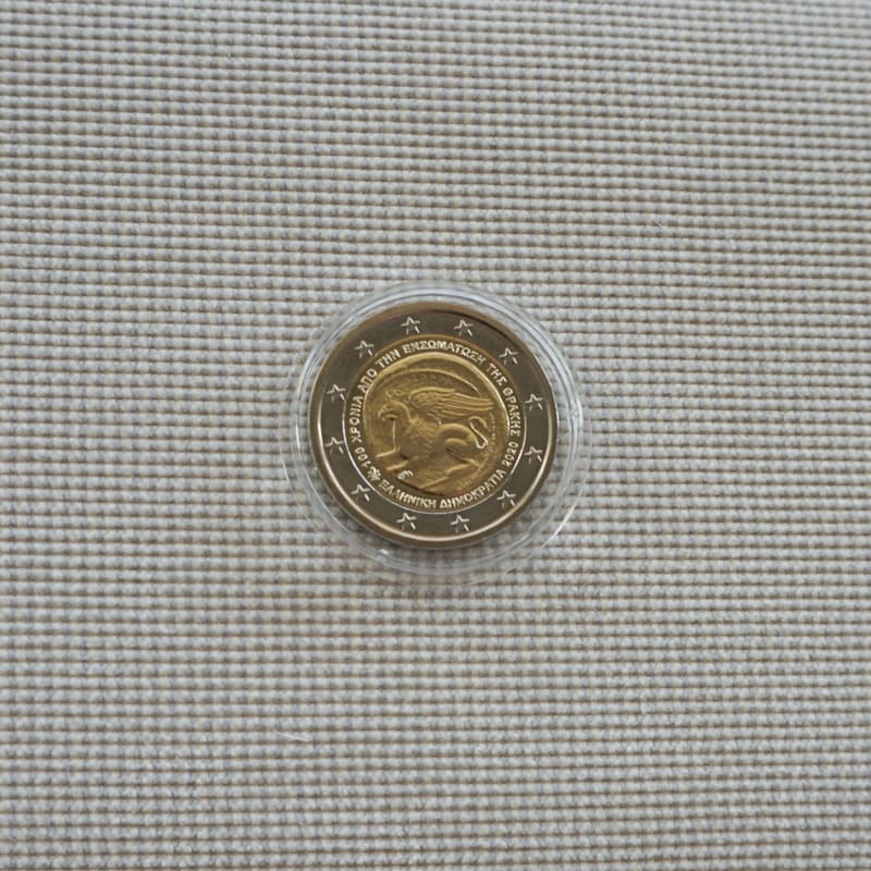 An ancient Thracian drachma coin from Avdira, with a griffin, surrounded by the inscription in Greek (100th Anniversary of the Union of Thrace), a palmette (the mint mark of the Greek Mint) on the bottom left, the date on the bottom right, the state name below. The twelve stars of the European Union surround the design on the outer ring.