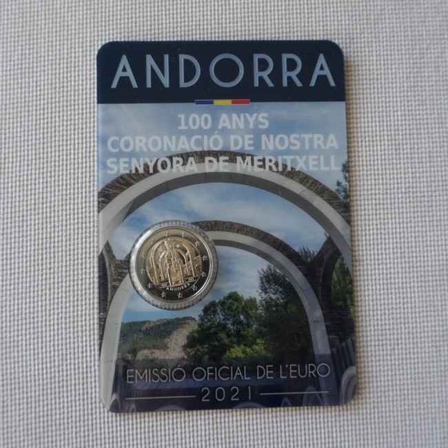 Foreground depicts the reproduction of the Romanesque carving of Our Lady of Meritxell (patron saint of the Principality of Andorra), which dates back from the 11th and 12th centuries. The background of the design shows a partial reproduction of the basilica sanctuary where it is located and a graphic element symbolizing a flower. Coin’s outer ring depicts the 12 stars of the European flag.