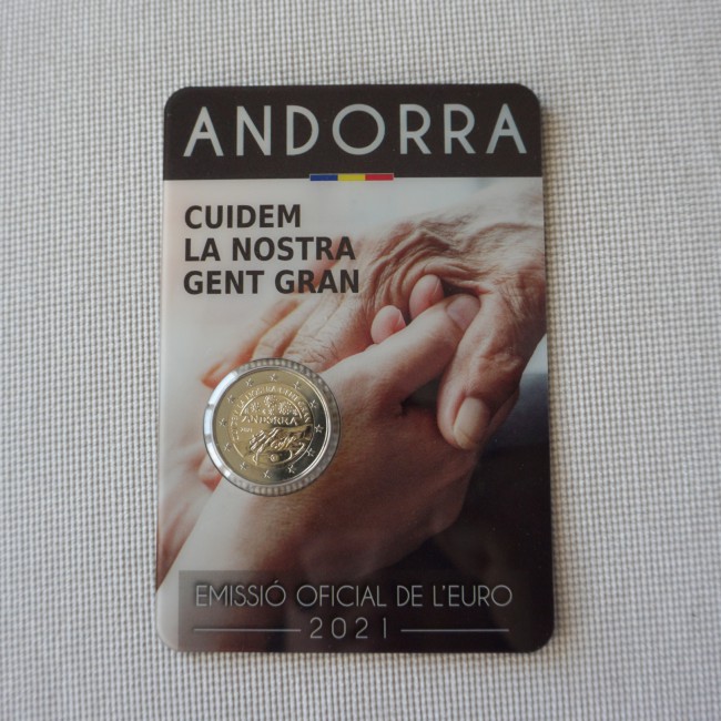 The subject of the coin is symbolized by the image of the hand of a young person holding another hand that shows all the signs of aging, with a stethoscope below them. Several reproductions of the SARSCoV-2 virus represents the State’s commitment to preventing its spread and caring for its citizens. Coin’s outer ring depicts the 12 stars of the European flag