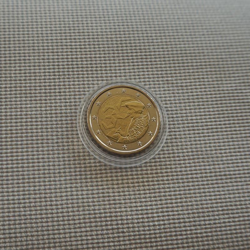 The design is a mix of two major elements of the Erasmus programme: the original intellectual inspiration, Erasmus himself, and the allegory of its influence over Europe. The first one is symbolised by one of the most known depiction of Erasmus. The second one is symbolised by a beam of links going across the coin from a beacon to another, representing the numerous intellectual and human exchanges between the European students. As a reference to Europe, some of these links form other stars, born from the synergy between the countries. The figure 35, for 35th anniversary comes out from the stars in a contemporary graphical style. The coin’s outer ring bears the twelve stars of the European Union.