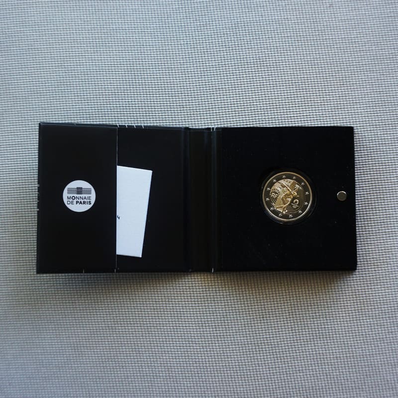 The design represents the genius, a national figure and icon of French numismatics. It is depicted practicing discus throwing in an ‘ancient’ way in reference to the Olympic Games of the Antique era. His silhouette blends with the one of the Arc de Triomphe, a key element of Parisian heritage. It forms a common axis with this emblematic monument of victory. In the background, an athletics track in which the emblem of Paris 2024 is inserted on the right side, is represented. The year date, the mention RF and the mintmarks are inserted under the arch and around the foot of the Arc._x005F_x000D_