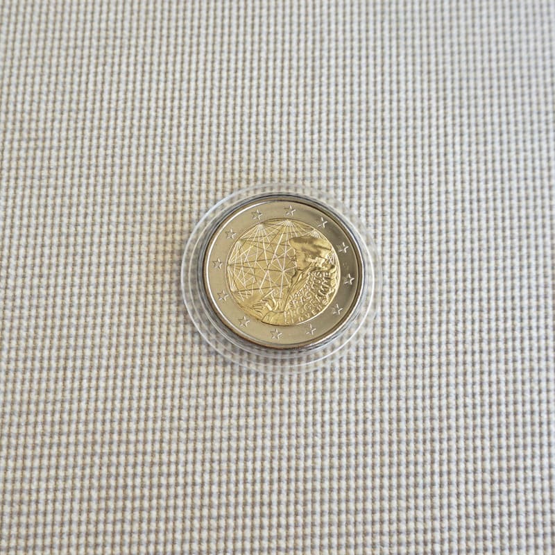 The design is a mix of two major elements of the Erasmus programme: the original intellectual inspiration, Erasmus himself, and the allegory of its influence over Europe. The first one is symbolised by one of the most known depiction of Erasmus. The second one is symbolised by a beam of links going across the coin from a beacon to another, representing the numerous intellectual and human exchanges between the European students. As a reference to Europe, some of these links form other stars, born from the synergy between the countries. The figure 35, for 35th anniversary comes out from the stars in a contemporary graphical style._x005F_x000D_