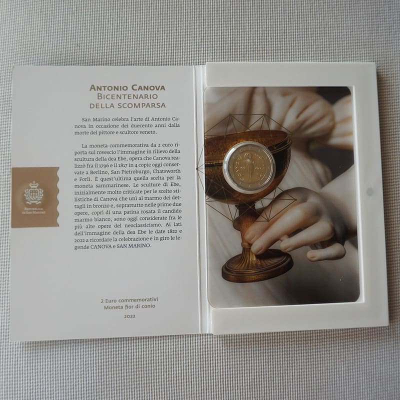 The goddess Hebe is depicted in the centre of the inner ring, taken from the work of Antonio Canova, conserved at the Art gallery of the Civic Museum of San Domenico in Forlì. Around are the inscriptions ‘CANOVA’ and ‘SAN MARINO’. At the left is the year ‘1822’ and the initials of the author Antonio Vecchio, and at the right the year of issuance ‘2022’ and the letter R, identifying the Mint of Rome._x005F_x000D_