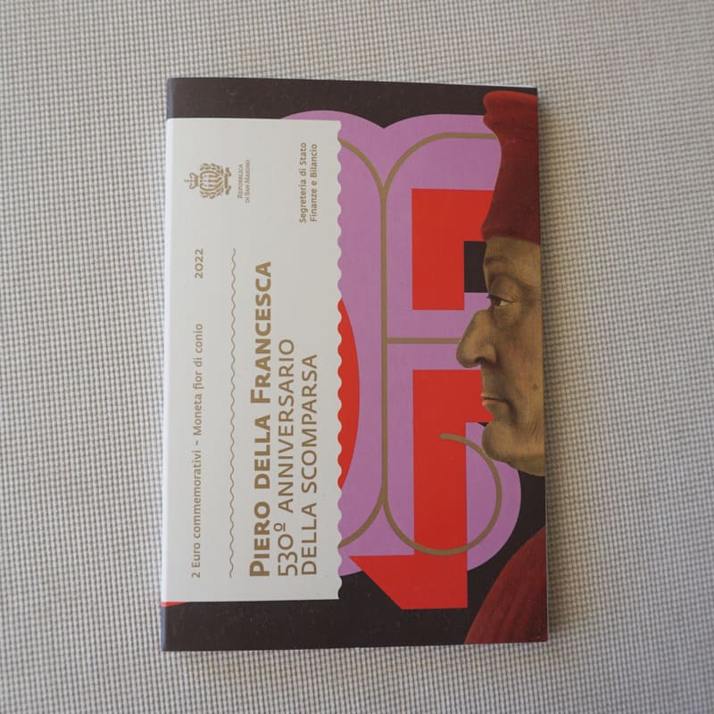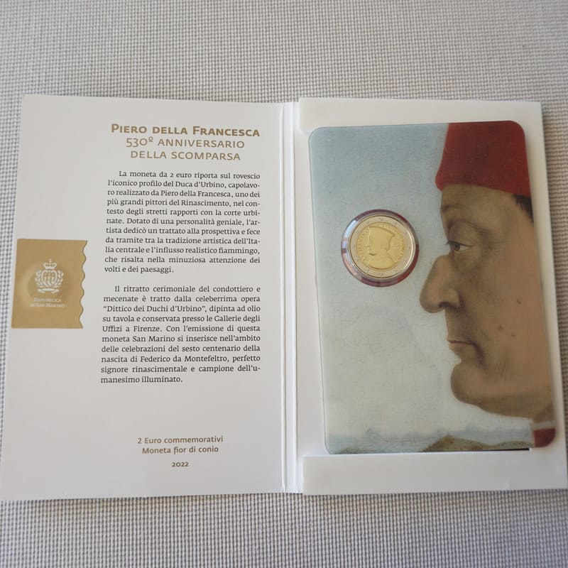 In the centre is the profile of Federico da Montefeltro, detail of the painting ‘Diptych of the Dukes of Urbino’ by Piero della Francesca, kept in the Galleries of the Uffizi (Florence). At the left side in semi circle is the inscription ‘SAN MARINO’. At the right side in semi-circle is the inscription ‘PIERO DELLA FRANCESCA’, the years 1492 e 2022, the letter R, identifying the Mint of Rome and the initials of author Claudia Momoni, ‘C.M.’_x005F_x000D_