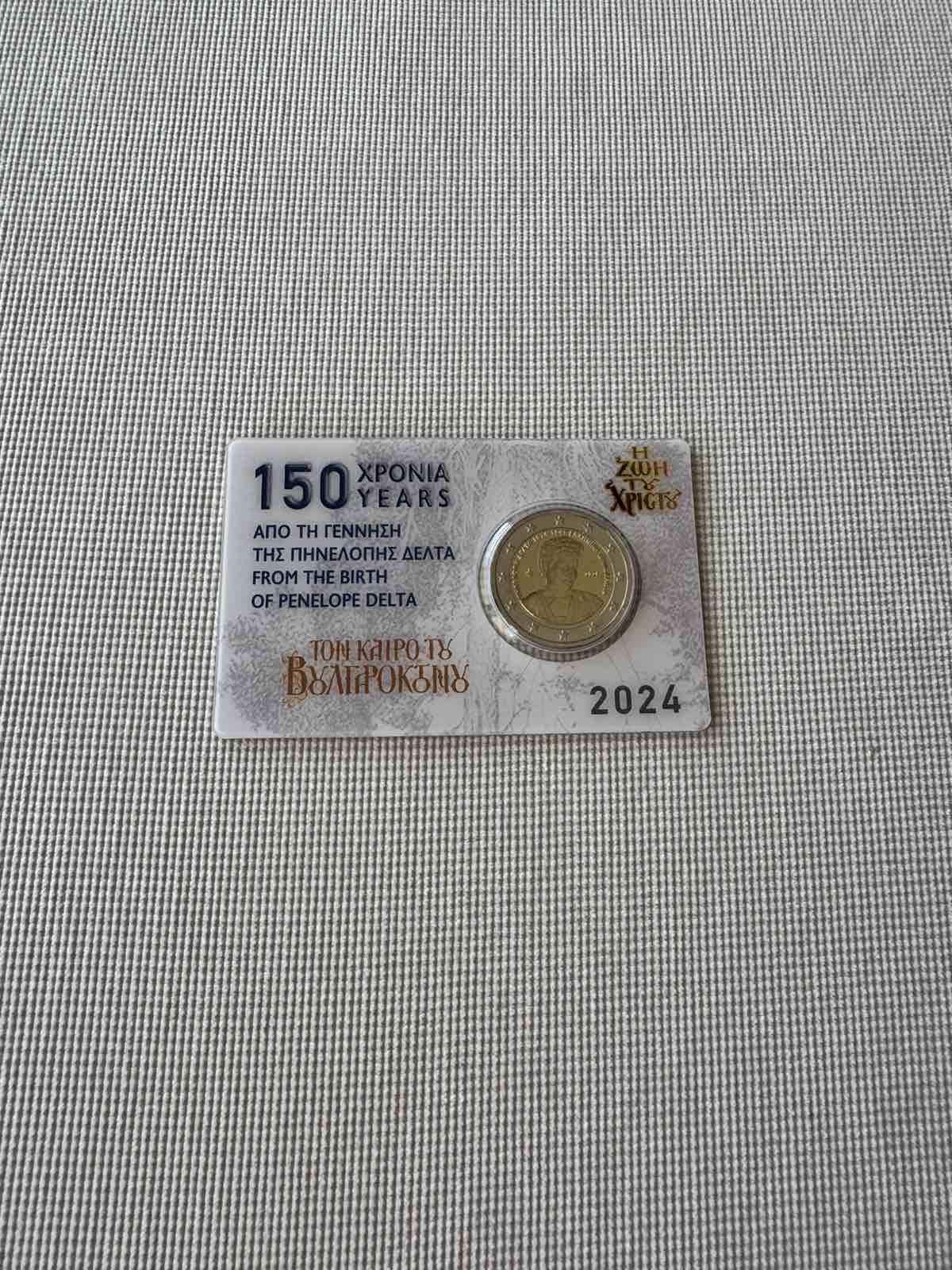 The design features a portrait of Penelope Delta. The theme is bordered by the wording ‘ΠΗΝΕΛΟΠΗ ΔΕΛΤΑ 1874-1941’ (‘PENELOPE DELTA 1874-1941’) and ‘ΕΛΛΗΝΙΚΗ ΔΗΜΟΚΡΑΤΙΑ’ (‘HELLENIC REPUBLIC’). To the left is a palmette (mintmark of the Greek Mint) and to the right the minting year. Penelope Delta was a pioneer of children’s literature in Greece. Generations of Greek children have been raised with her books, which remain popular.