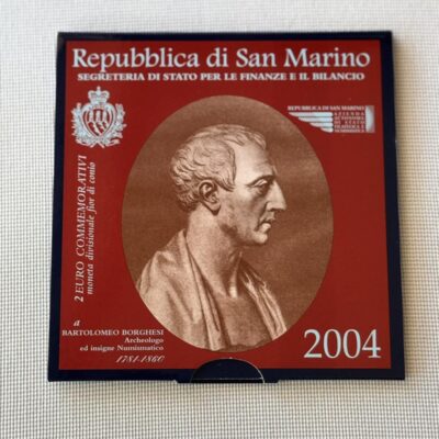 The twelve stars of the European Union positioned around the outer circle of the coin and the issuing year ‘2004’, positioned bottom centre, surround the bust of Bartolomeo Borghesi. To the left of the bust is the inscription ‘Bartolomeo Borghesi’, and one above the other are the letter ‘R’ and the engraver’s initials ‘E.L.F.’. To the right of the bust is the word ‘San Marino’.