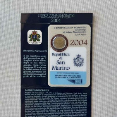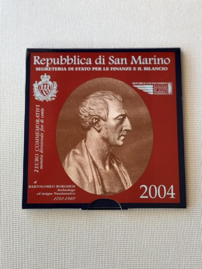 The twelve stars of the European Union positioned around the outer circle of the coin and the issuing year ‘2004’, positioned bottom centre, surround the bust of Bartolomeo Borghesi. To the left of the bust is the inscription ‘Bartolomeo Borghesi’, and one above the other are the letter ‘R’ and the engraver’s initials ‘E.L.F.’. To the right of the bust is the word ‘San Marino’.