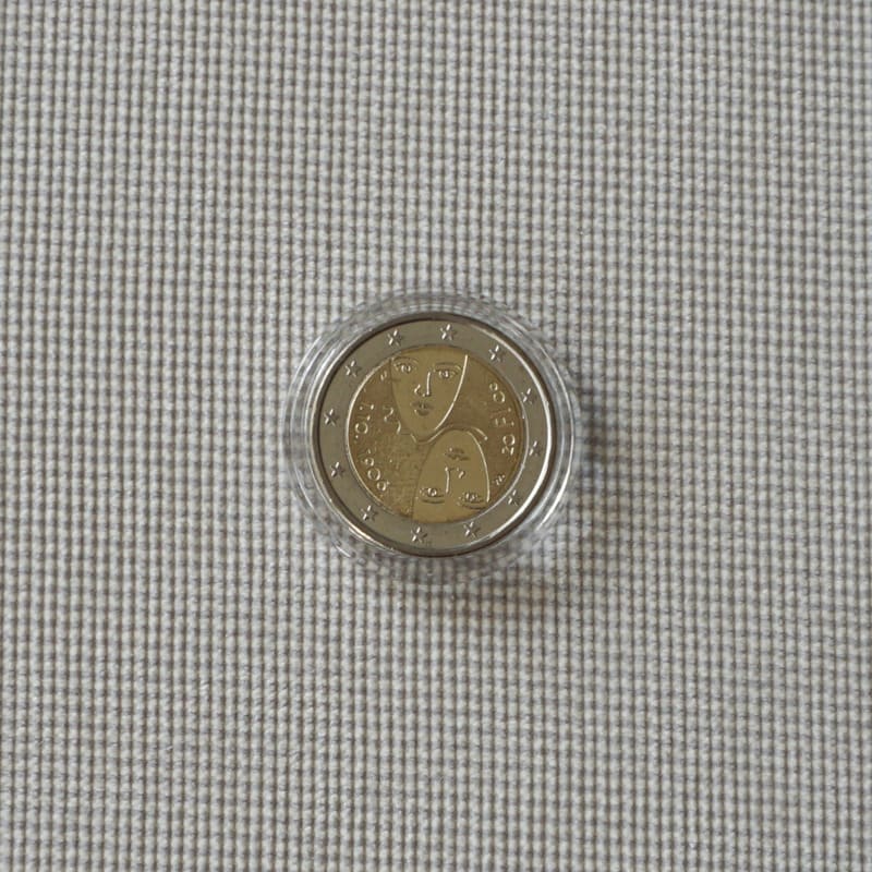 The inner part of the coin shows male and female faces separated by a line. To their left is ‘1.10.1906’ and to their right is ‘20 FI 06’, the year of issue with the abbreviation for Finland, FI. The mint mark ‘M’ appears next to each of the two faces. The 12 stars of the European Union are depicted on the outer ring of the coin.