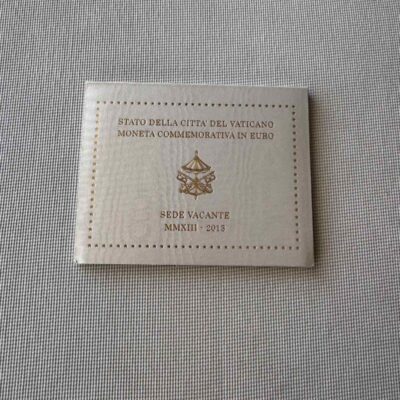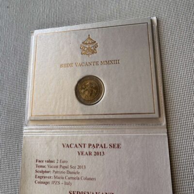 The design features the coat of arms of the Cardinal Camerlengo and above it the symbol of the Apostolic Camera, two small crosses, the words ‘CITTÀ DEL VATICANO’ at the left and ‘SEDE VACANTE MMXIII’ at the right. The coin’s outer ring bears the twelve stars of the European Union.