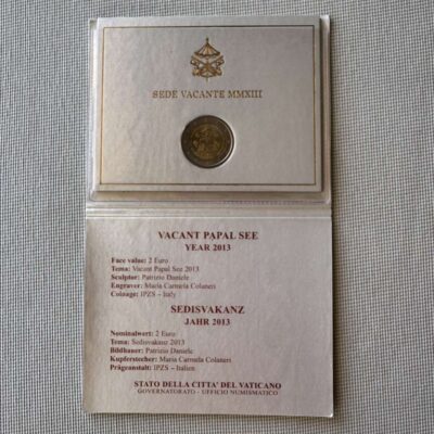 The design features the coat of arms of the Cardinal Camerlengo and above it the symbol of the Apostolic Camera, two small crosses, the words ‘CITTÀ DEL VATICANO’ at the left and ‘SEDE VACANTE MMXIII’ at the right. The coin’s outer ring bears the twelve stars of the European Union.
