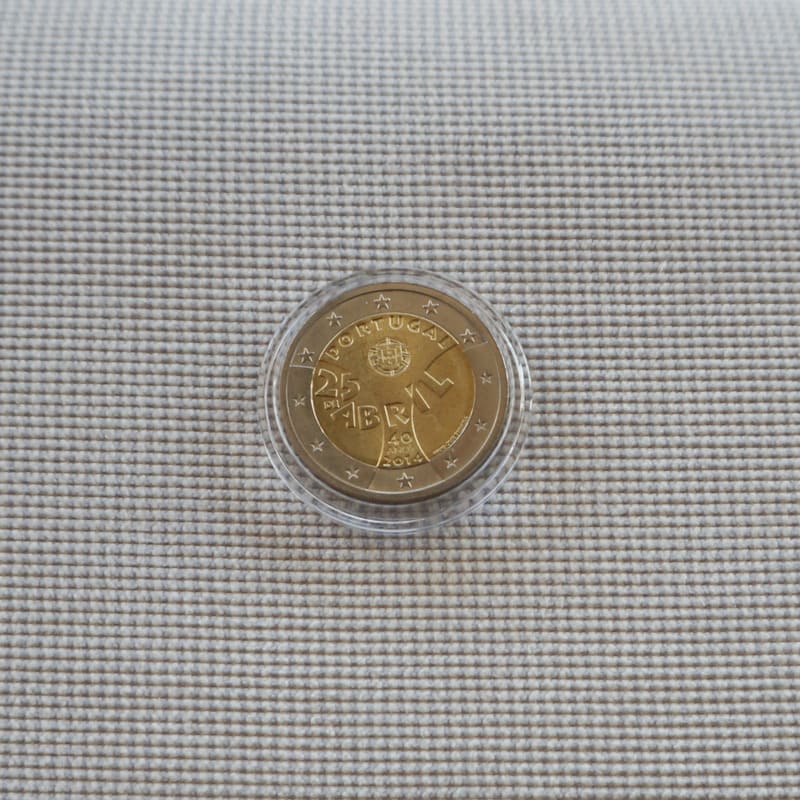 The two curves represent the general shape of a carnation, the flower symbolizing the movement, which was also the origin of the revolution’s name. The name of the issuing country ‘PORTUGAL’ and the Coat of Arms are inscribed on the top of the flower. The center of the image shows the date of the event ‘25 DE ABRIL’ (25th April) and at the bottom is written the number of years past since the revolution ‘40 ANOS’ (40 years) and the year of issuance ‘2014’. The shape of the letters and numbers is inspired by those used in posters and other political information supports 40 years ago, as a symbol of the euphoric period lived right after the event. The coin’s outer ring bears the 12 stars of the European Union.