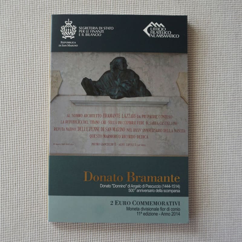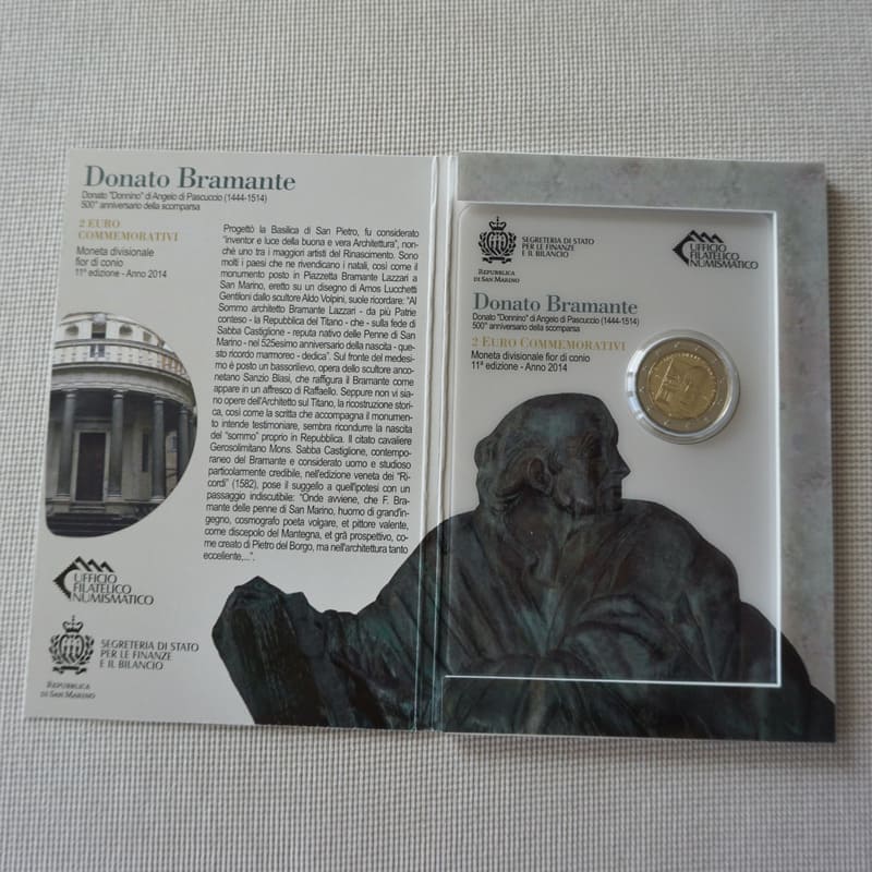 The coin depicts Bramante’s portrait, and part of Tempietto (Italian: ‘small temple’), which is a small commemorative tomb built by Donato Bramante, possibly as early as 1502, in the courtyard of San Pietro in Montorio and considered a masterpiece of the High Renaissance Italian architecture. The inscription ‘BRAMANTE LAZZARI DELLE PENNE DI SAN MARINO’ surrounds almost completely the design. At the left and right the years ‘1514’ and ‘2014’, respectively. At the bottom the initials of the artist ‘MCC’ (Maria Carmela Colaneri) and the mint mark. The coin’s outer ring bears the 12 stars of the European Union.