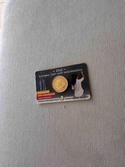 The inner part of the coin depicts a hand holding a globe of the Earth with a plant in the foreground. The inscription ‘2015 EUROPEAN YEAR FOR DEVELOPMENT’ features in an arc above the globe. The country code ‘BE’ appears beneath the hand while the signature mark of the Master of the Mint and the mark of the Brussels mint, a helmeted profile of the archangel Michael, is to its left. The coin’s outer ring bears the 12 stars of the European Union.