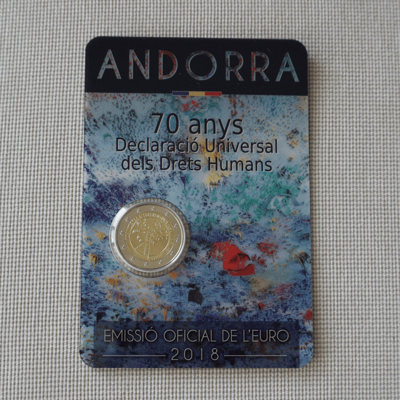 Seven staircases (representing the seven parishes or administrative divisions of Andorra) in the shape of mountains that lead to the valley. These staircases are, at the same time, the branches of a tree symbolizing humankind. 30 leaves come out of the branches of this tree representing the 30 articles of the Universal Declaration of Human Rights. Coin’s outer ring depicts the 12 stars of the European flag.