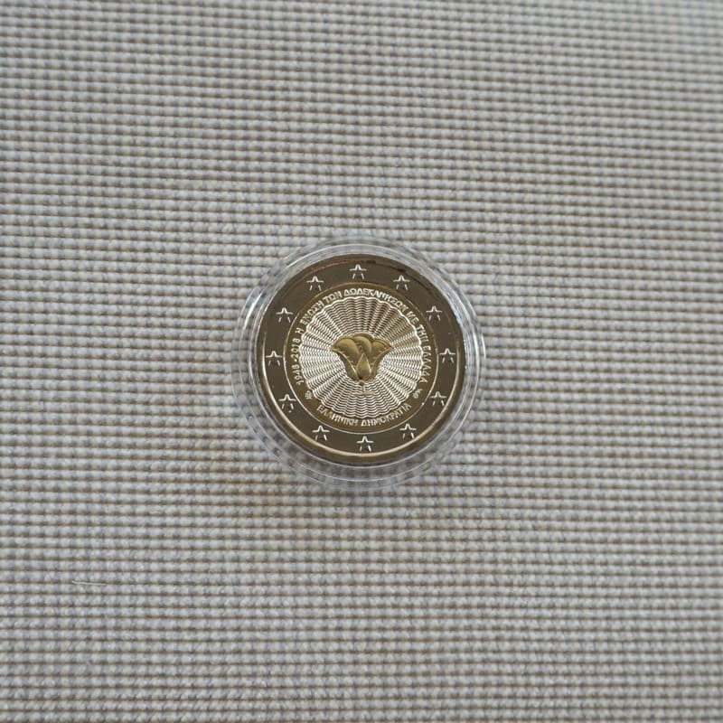 A rose, the canting badge of Rhodes, inspired from a coin minted by the ancient city of Rhodes, one of the most characteristic coins of the Dodecanese, with stylised waves fanning out from the centre. Inscribed along the inner edge is the wording ‘1948-2018 THE UNION OF THE DODECANESE WITH GREECE’ and the country name. Also visible at left is a palmette (the mintmark of the Greek mint) and, at right, the monogram of the artist (George Stamatopoulos). The coin’s outer ring depicts the 12 stars of the European flag.