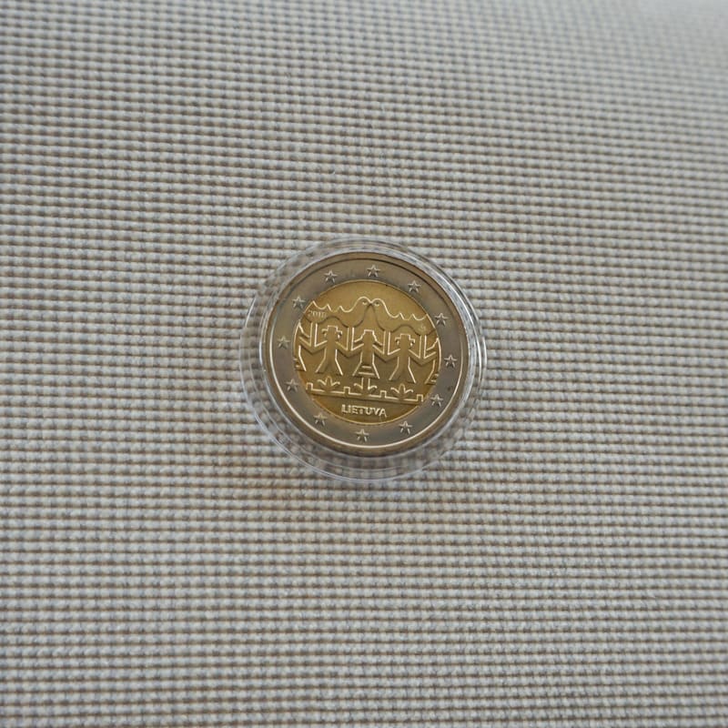 The national side of the coin features stylised figures of people and birds that are symbolic of the Lithuanian folk dance and song and typical of paper cuttings, a Lithuanian folk art genre. The coin also features the inscription LIETUVA (LITHUANIA), year (2018) and the mintmark of the Lithuanian Mint. The coin’s outer ring bears the 12 stars of the European Union flag.