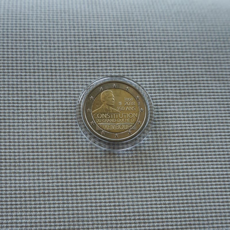 The coin bears the effigy of His Royal Highness Grand Duke Henri on the left, looking to the right. To the right of the design are the dates “1868-2018” and the words “150 years”. Below the effigy of the Grand Duke, the text “Constitution of the Grand Duchy of Luxembourg” and a side section of an open book are shown.