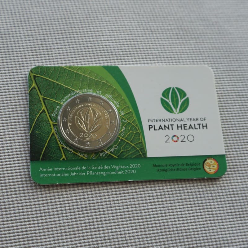 The piece is dedicated to the International Year of Plant Health and shows in the middle the official logo of the International Year of Plant Health (IYPH 2020). The leaves, arranged like a globe, symbolize healthy plants as a source of oxygen that we breathe, the food we eat and all life on planet Earth. Above is the edition event in English and on the left the mint sign of Ingrid van Herzele and on the right the coin sign of the Dutch Mint in Utrecht. The country abbreviation “BE” and the year “2020” are arranged at the bottom of the image. The twelve stars of the European flag are represented on the outer ring of the coin.