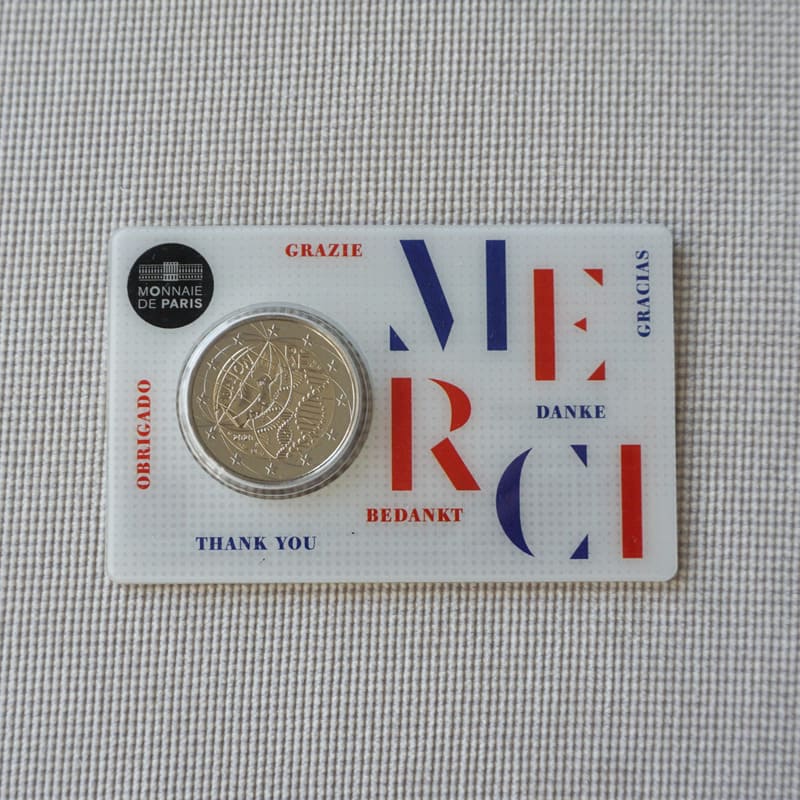 The obverse of the coin represents the figuration of the human in union, represented by a face inscribed in a sphere. It faces the infinitely small, represented by fragments of DNA inscribed in a circle. By its oblique axis, this allegory represents the research and its intelligence dominating the infinitely small; studying it and triumphing over the diseases.
