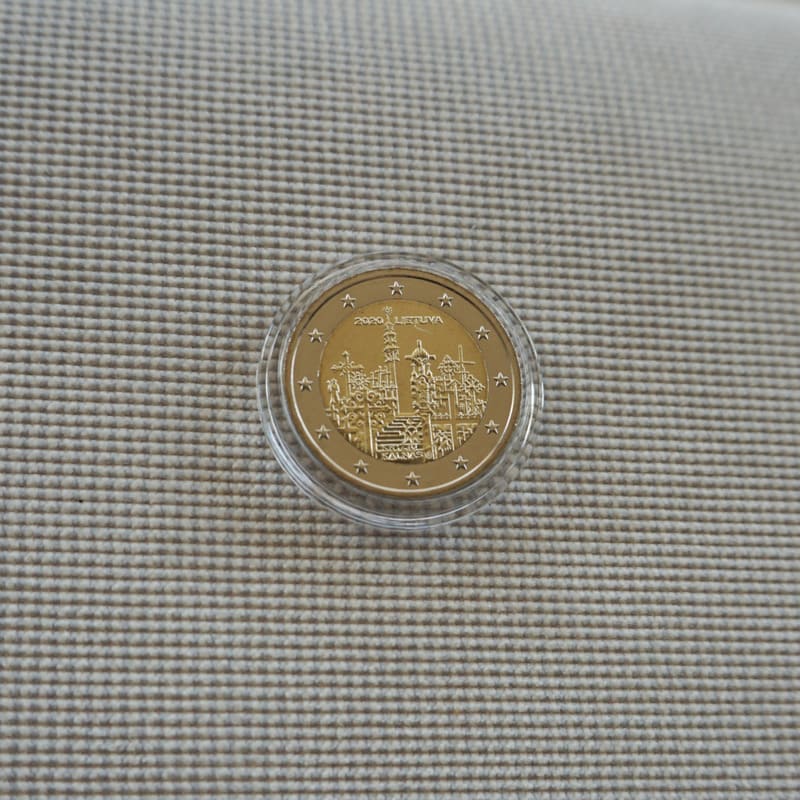 The national side of the coin depicts the Hill of Crosses: fragments of wooden and forged crosses, symbolising Lithuanian cross-crafting and folk culture. Cross-crafting and cross-symbolism in Lithuania are included in the UNESCO Representative List of the Intangible Cultural Heritage of Humanity. The coin features the inscriptions LIETUVA (LITHUANIA) and KRYŽIŲ KALNAS (THE HILL OF CROSSES), year (2020) and the mintmark of the Lithuanian Mint.