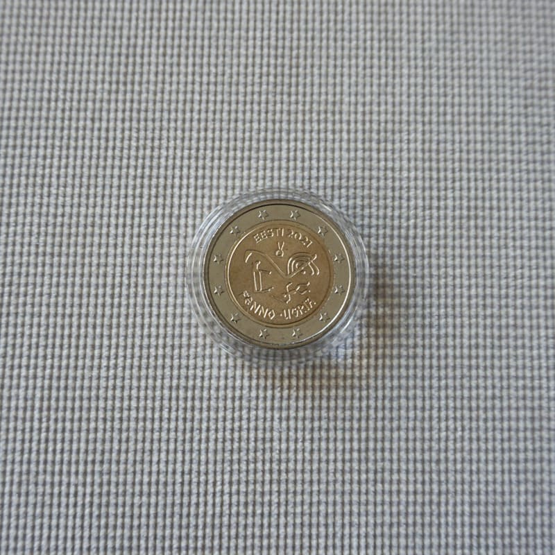 The national side of the coin depicts a design based on the cave drawings of Lake Äänisjärv. The symbols for the hunter, the elk, the water bird and the sun form the symbolic circle of life for the Finno-Ugric peoples. The central figure is a water bird, as they are represented in the art and folklore of all Finno-Ugric peoples. On the top right, in semi-circle, are the name of the country ‘EESTI’ followed by the year ‘2021’. At the bottom left is the inscription ‘FENNOUGRIA’._x005F_x000D_