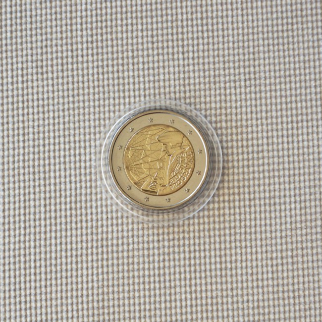 The design is a mix of two major elements of the Erasmus programme: the original intellectual inspiration, Erasmus himself, and the allegory of its influence over Europe. The first one is symbolised by one of the most known depiction of Erasmus. The second one is symbolised by a beam of links going across the coin from a beacon to another, representing the numerous intellectual and human exchanges between the European students. As a reference to Europe, some of these links form other stars, born from the synergy between the countries. The figure 35, for 35th anniversary comes out from the stars in a contemporary graphical style._x005F_x000D_