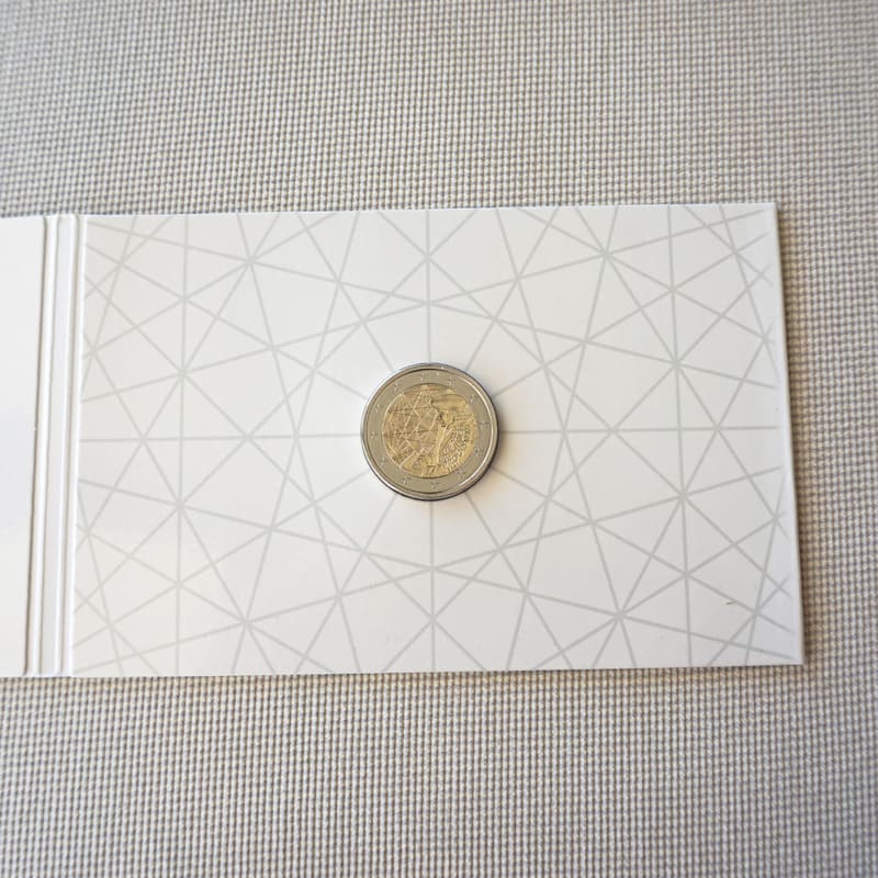 The design is a mix of two major elements of the Erasmus programme: the original intellectual inspiration, Erasmus himself, and the allegory of its influence over Europe. The first one is symbolised by one of the most known depiction of Erasmus. The second one is symbolised by a beam of links going across the coin from a beacon to another, representing the numerous intellectual and human exchanges between the European students. As a reference to Europe, some of these links form other stars, born from the synergy between the countries. The figure 35, for 35th anniversary comes out from the stars in a contemporary graphical style._x005F_x000D_