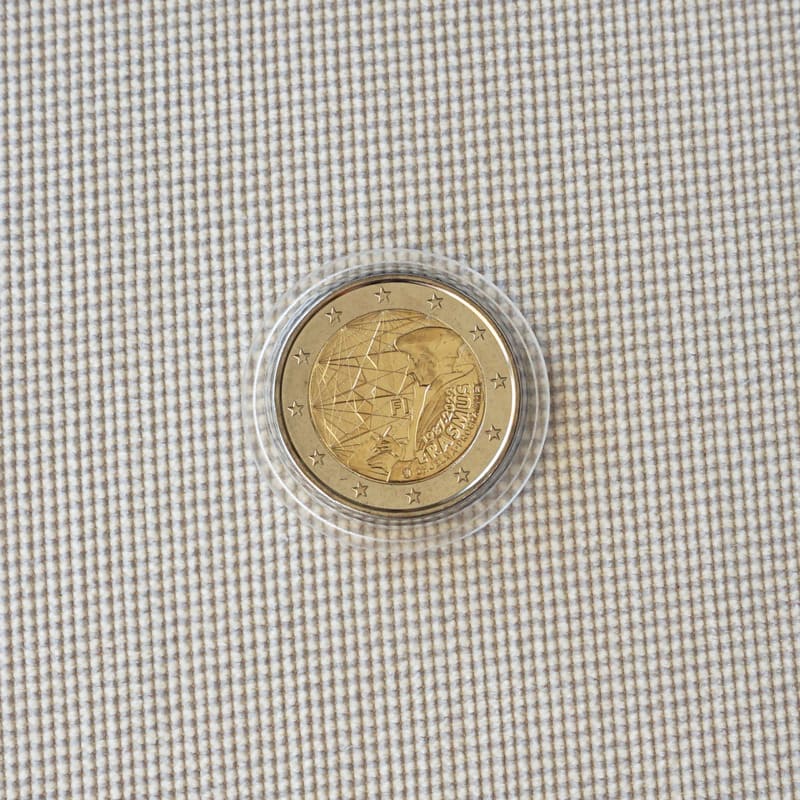 The design is a mix of two major elements of the Erasmus programme: the original intellectual inspiration, Erasmus himself, and the allegory of its influence over Europe. The first one is symbolised by one of the most known depiction of Erasmus. The second one is symbolised by a beam of links going across the coin from a beacon to another, representing the numerous intellectual and human exchanges between the European students. As a reference to Europe, some of these links form other stars, born from the synergy between the countries. The figure 35, for 35th anniversary comes out from the stars in a contemporary graphical style._x005F_x000D_