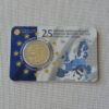 The design is a mix of two major elements of the Erasmus programme: the original intellectual inspiration, Erasmus himself, and the allegory of its influence over Europe. The first one is symbolised by one of the most known depiction of Erasmus. The second one is symbolised by a beam of links going across the coin from a beacon to another, representing the numerous intellectual and human exchanges between the European students. As a reference to Europe, some of these links form other stars, born from the synergy between the countries. The figure 35, for 35th anniversary comes out from the stars in a contemporary graphical style._x005F_x000D_