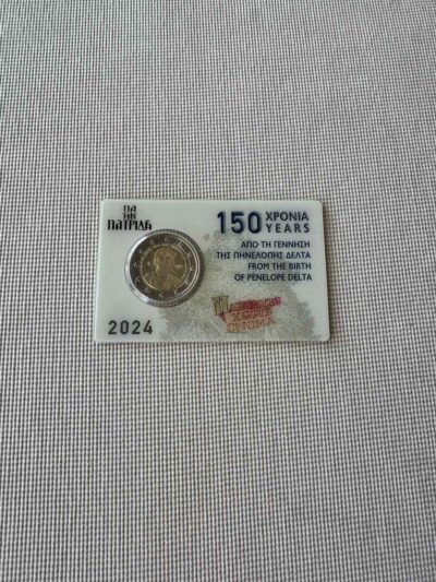 The design features a portrait of Penelope Delta. The theme is bordered by the wording ‘ΠΗΝΕΛΟΠΗ ΔΕΛΤΑ 1874-1941’ (‘PENELOPE DELTA 1874-1941’) and ‘ΕΛΛΗΝΙΚΗ ΔΗΜΟΚΡΑΤΙΑ’ (‘HELLENIC REPUBLIC’). To the left is a palmette (mintmark of the Greek Mint) and to the right the minting year. Penelope Delta was a pioneer of children’s literature in Greece. Generations of Greek children have been raised with her books, which remain popular.