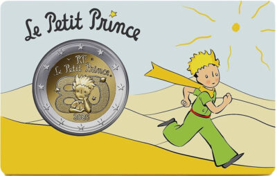 The face of this coin features the logo celebrating the 80th anniversary of the release of The Little Prince in France. The Little Prince is shown pensive. Behind him is “80”, a reference to the anniversary. Above him is “Le Petit Prince”, along with “RF” for République Française and the two hallmarks. Below the Little Prince is the year 2026.