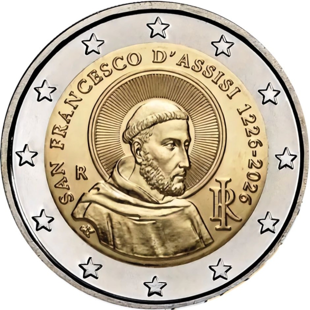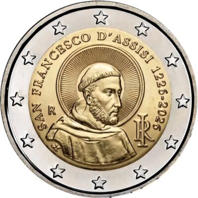 At the centre, an image of Saint Francis of Assisi inspired by a 14th-century fresco by Simone Martini located in the Basilica of Saint Francis, Assisi (Umbria, Italy). Around, the inscription “SAN FRANCESCO D’ASSISI 1226-2026”, the year of the Saint’s death and the year of the coin’s issue, respectively. At the bottom right, “RI acronym for the Italian Republic. On the left “R”, identifying the Mint of Rome, and at the bottom left “AV”, the designer’s signature. Arc-shaped, the twelve stars of the European Union.